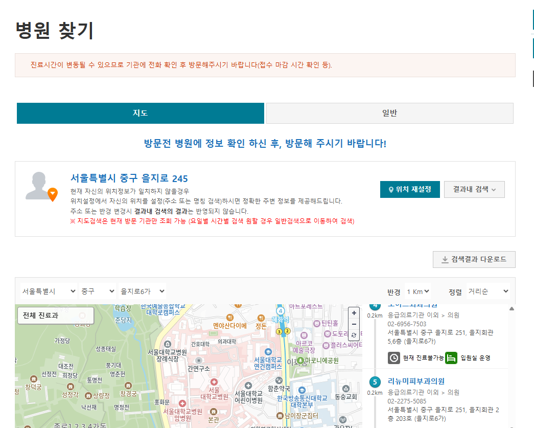 - 메뉴: ‘의료정보 → 병원/약국 찾기’